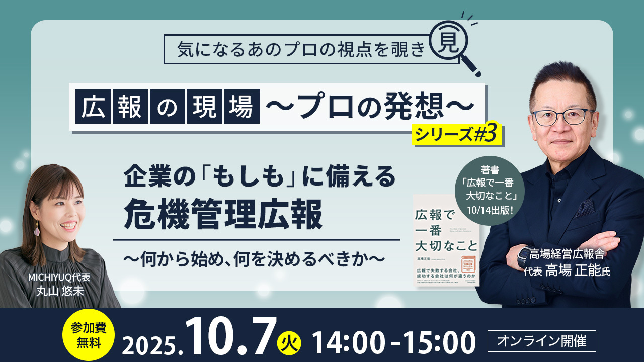 株式会社MICHIYUQ 代表丸山 悠未(Xアカウント:@yuu3_maru3)大手旅行会社での法人旅行の企画営業、経営コンサル事業のベンチャーでの企画職を経て、 EC、通販のマーケティング支援を行うスタートアップでひとり広報として広報部門を立ち上げ担う。2024年4月にMICHIYUQを創業し、マーケティングと連動し広報支援を行う。PR TIMES公認プレスリリースエバンジェリスト。PRSJ認定PRプランナー。