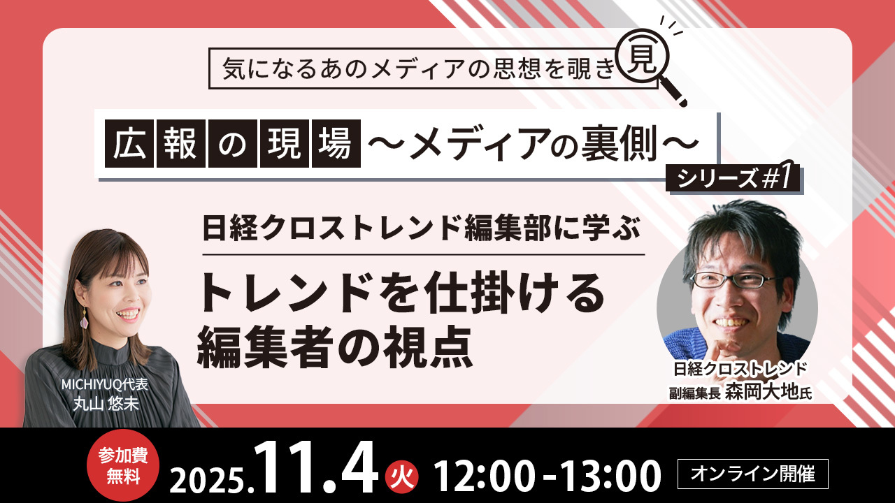 次回ウェビナーのご案内 気になるあの会社の広報活動を覗き見👀 広報の現場〜メディアの裏側〜シリーズ#1 日経クロストレンド編集部に学ぶ トレンドを仕掛ける編集者の視点